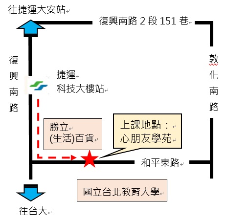 文湖線「科技大樓站」出口往左,經麥當勞步行至勝立百貨左轉和平東路,步行約3分鐘可抵達。
