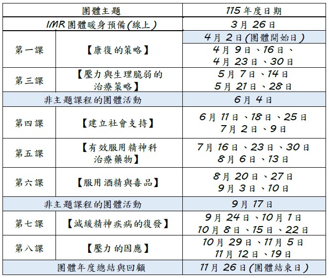 115年度【IMR康復成長團體】自4/2 (四)開始囉!每週下午2點半到4點半,地點改在心朋友學苑 (近捷運科技大樓站)歡迎踴躍報名!